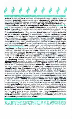 “Misread” — a manifesto for typographers — closes the book while keeping the conversation alive. It points forward by creating a parallel text using typographic means. The deeply cynical realm of advertising has long since colonized this simple formal device for generating multiple meanings in an hysterical register. In the hands of so-called creatives, this technique yields mostly witless double entendres. One must look elsewhere, it seems, for the small pleasures of dissimulation.