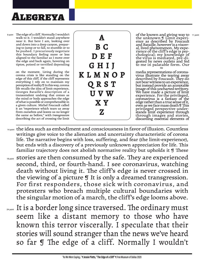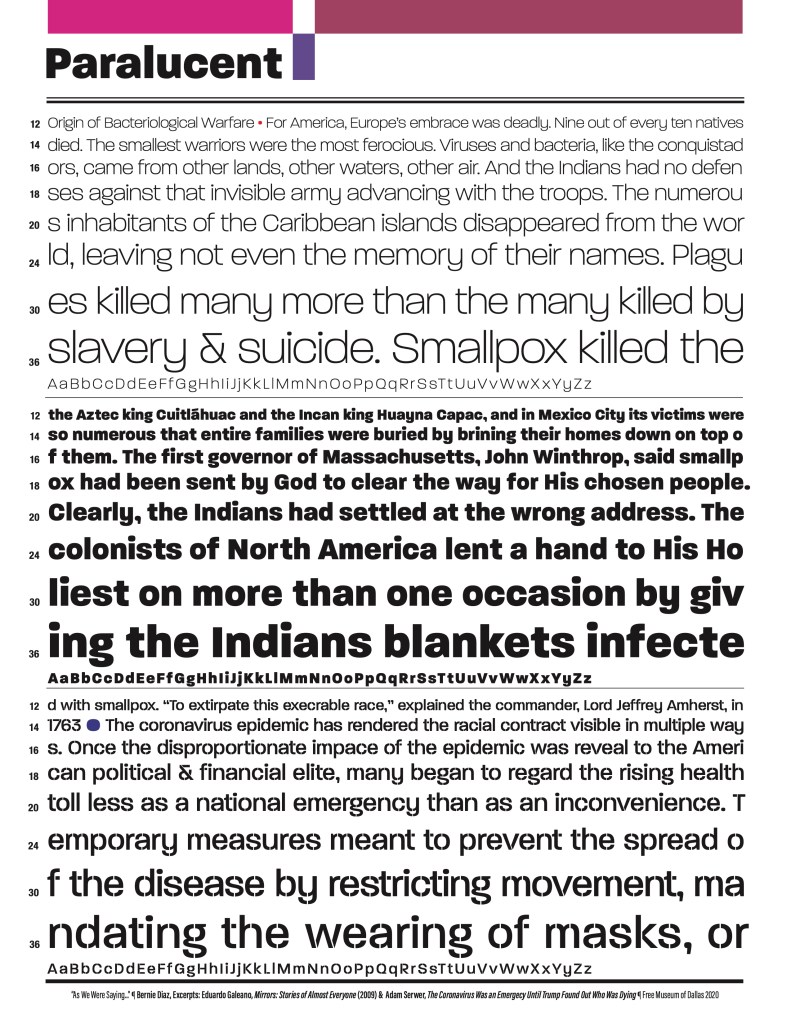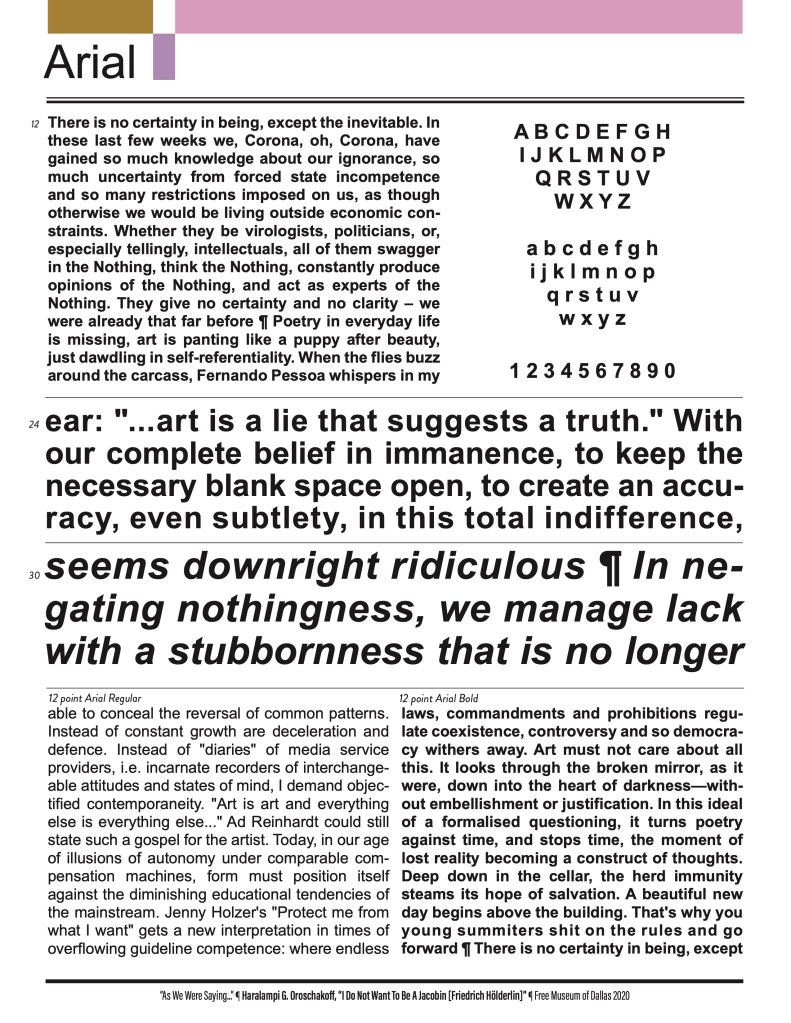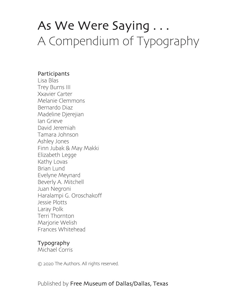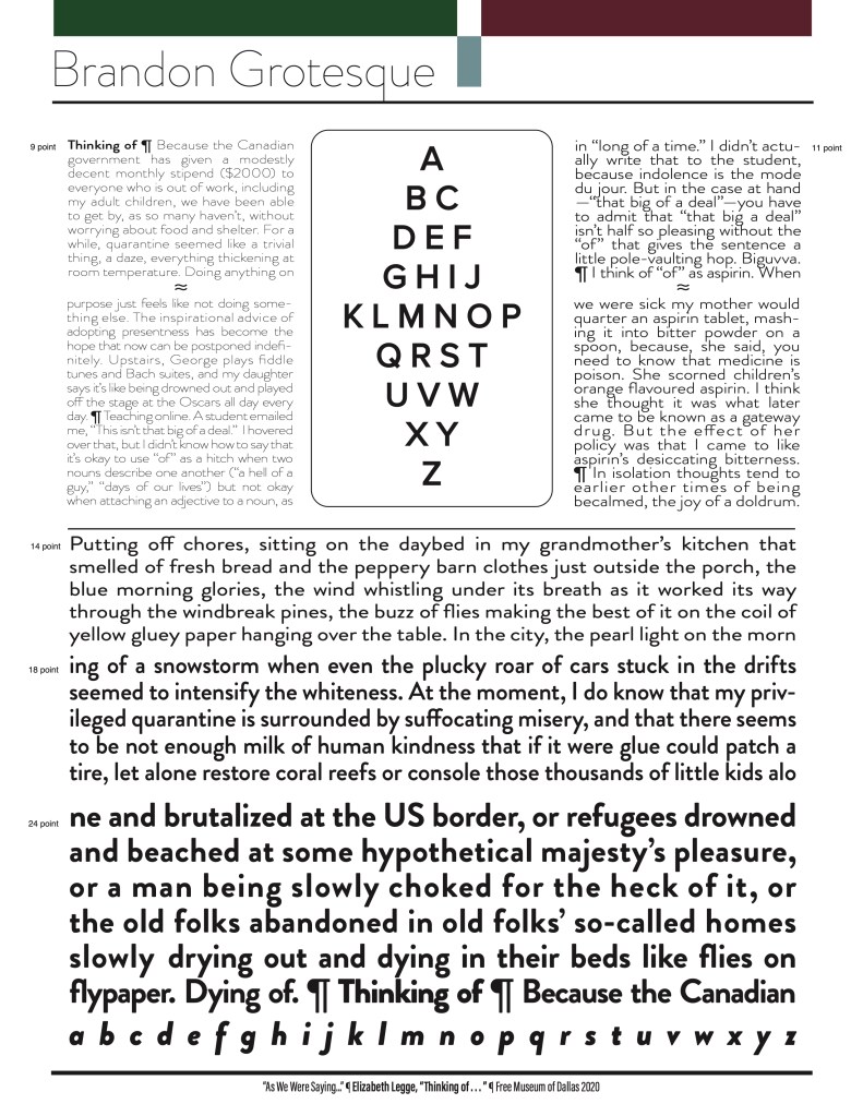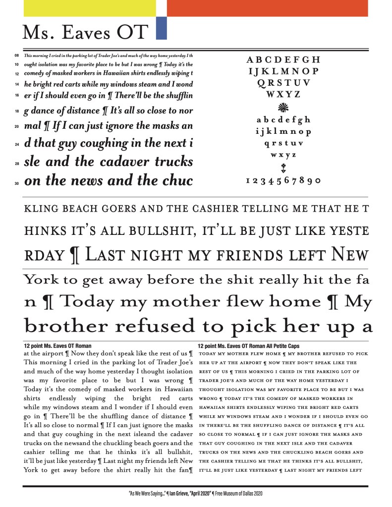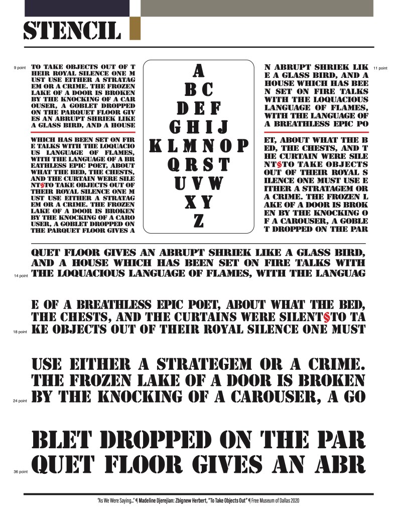 Sometimes, owing to its length, the contributor’s text will be repeated. We like to think that such a repetition suggests a possible performative use for the type sample; perhaps as a script for reading aloud in several voices.