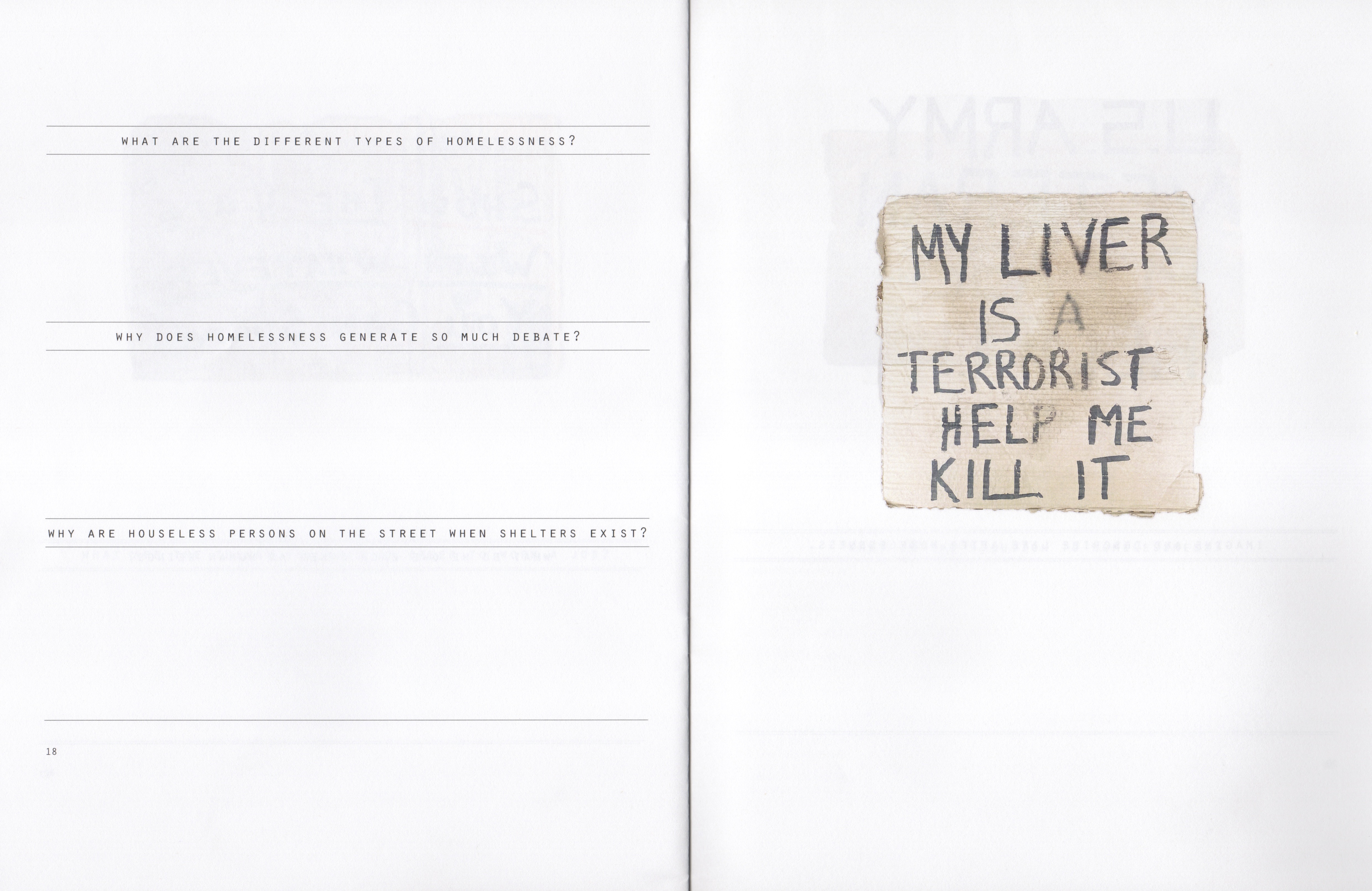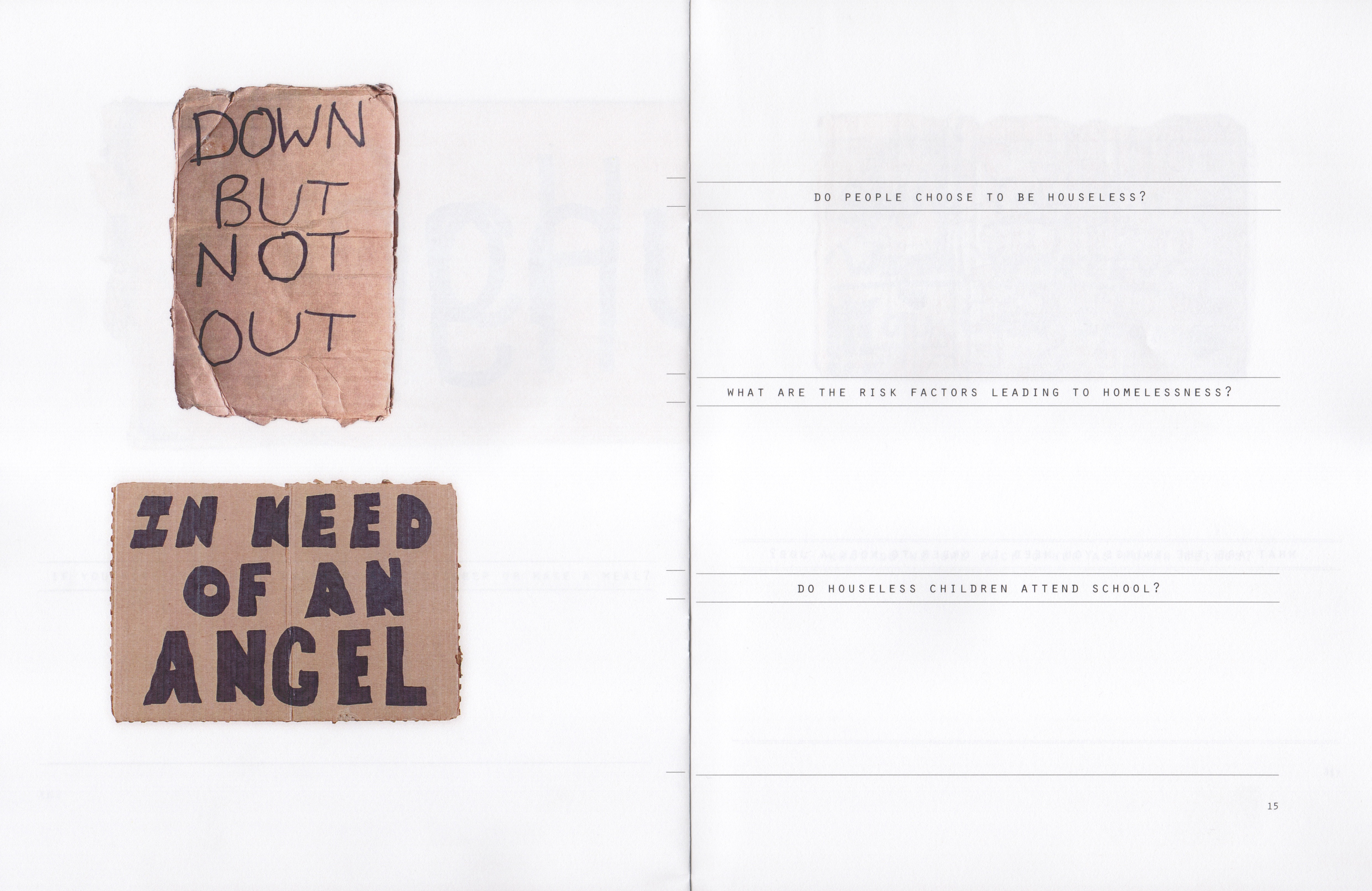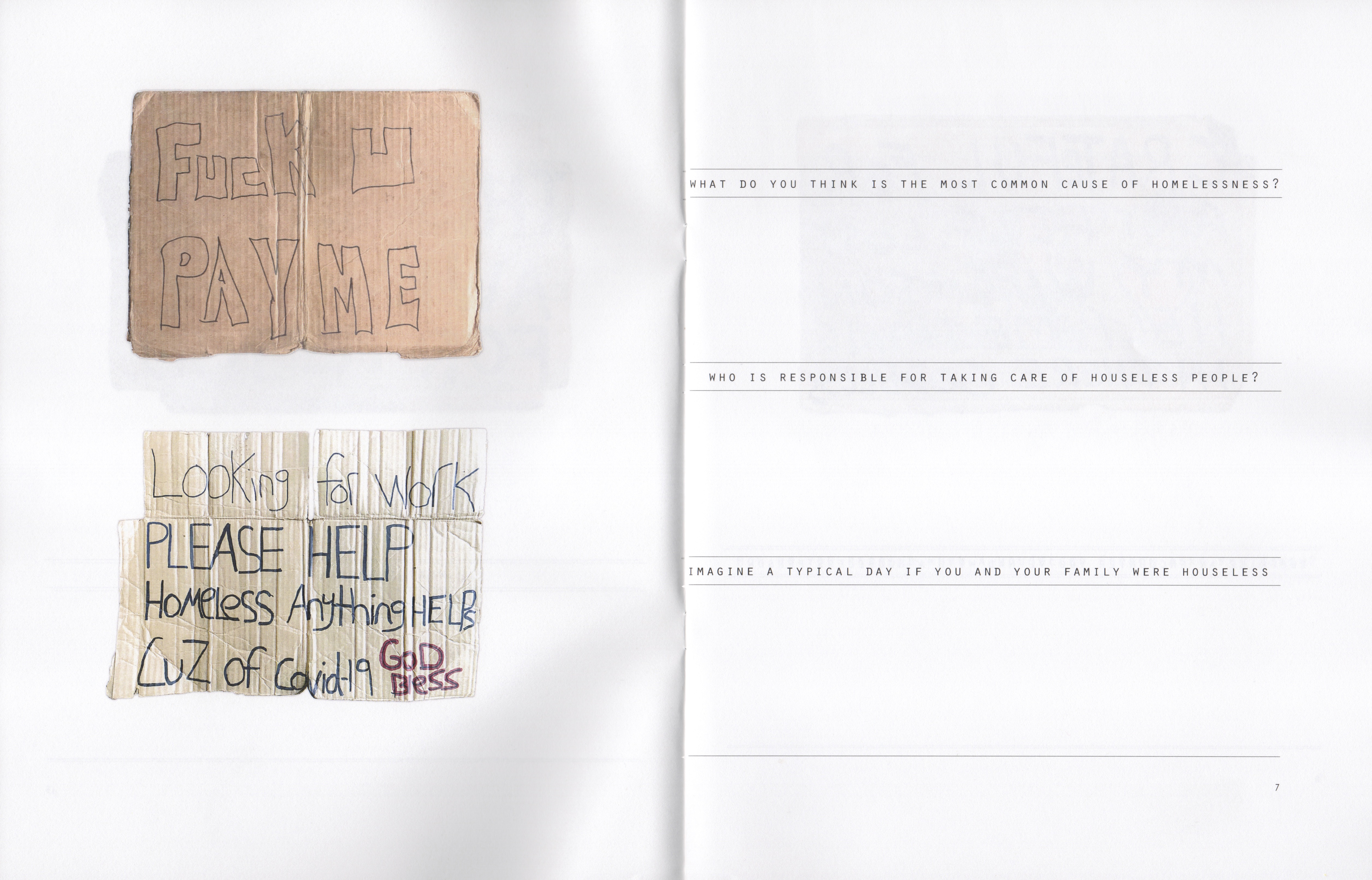 Incident on the Street is a workbook aimed at the general public. Employing a series of open-ended prompts, Incident on the Street aims to challenge assumptions about unhoused individuals that may distort our understanding of their circumstances, encourage their dehumanization, and support simplistic solutions to this ubiquitous social problem.