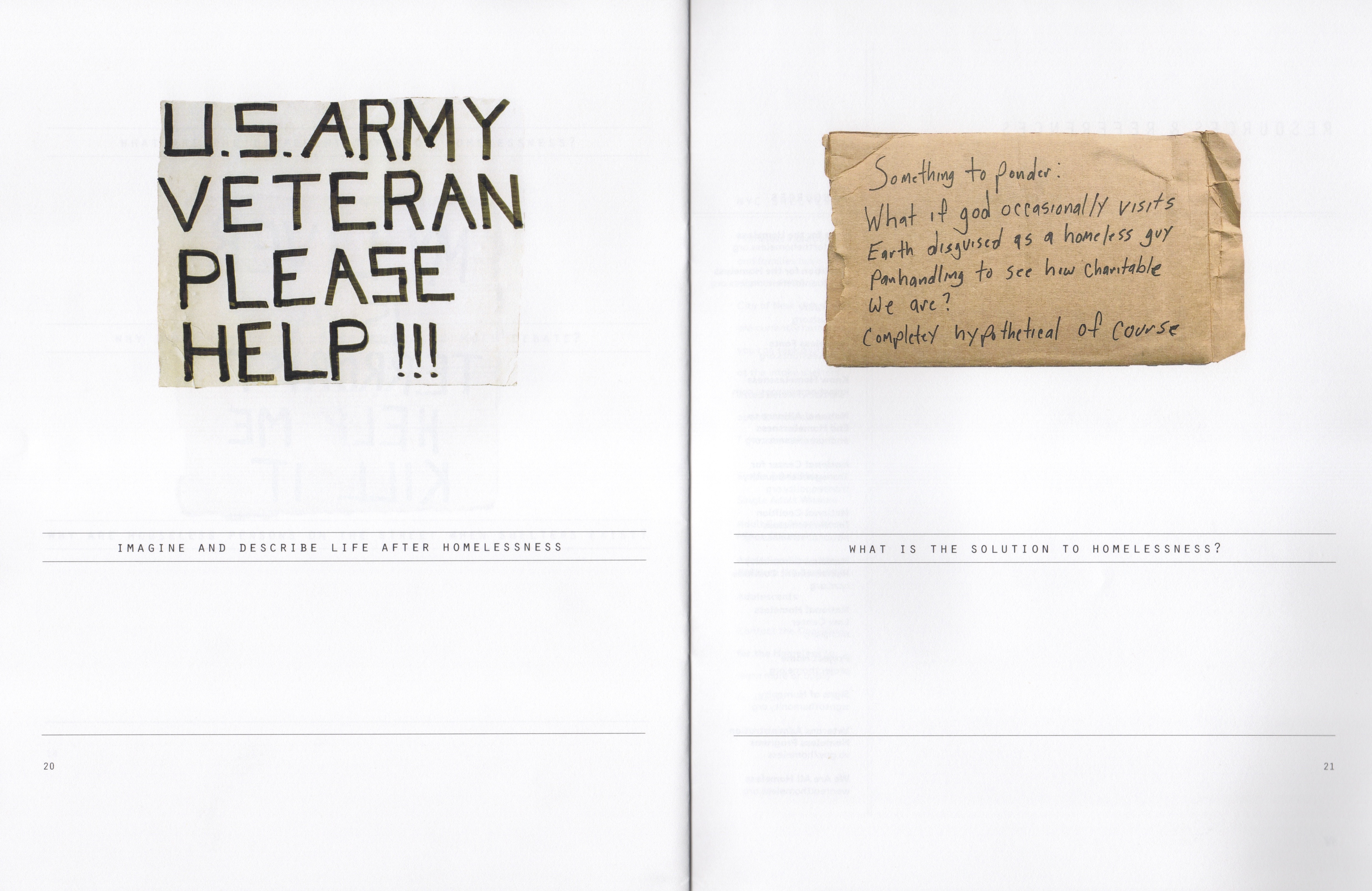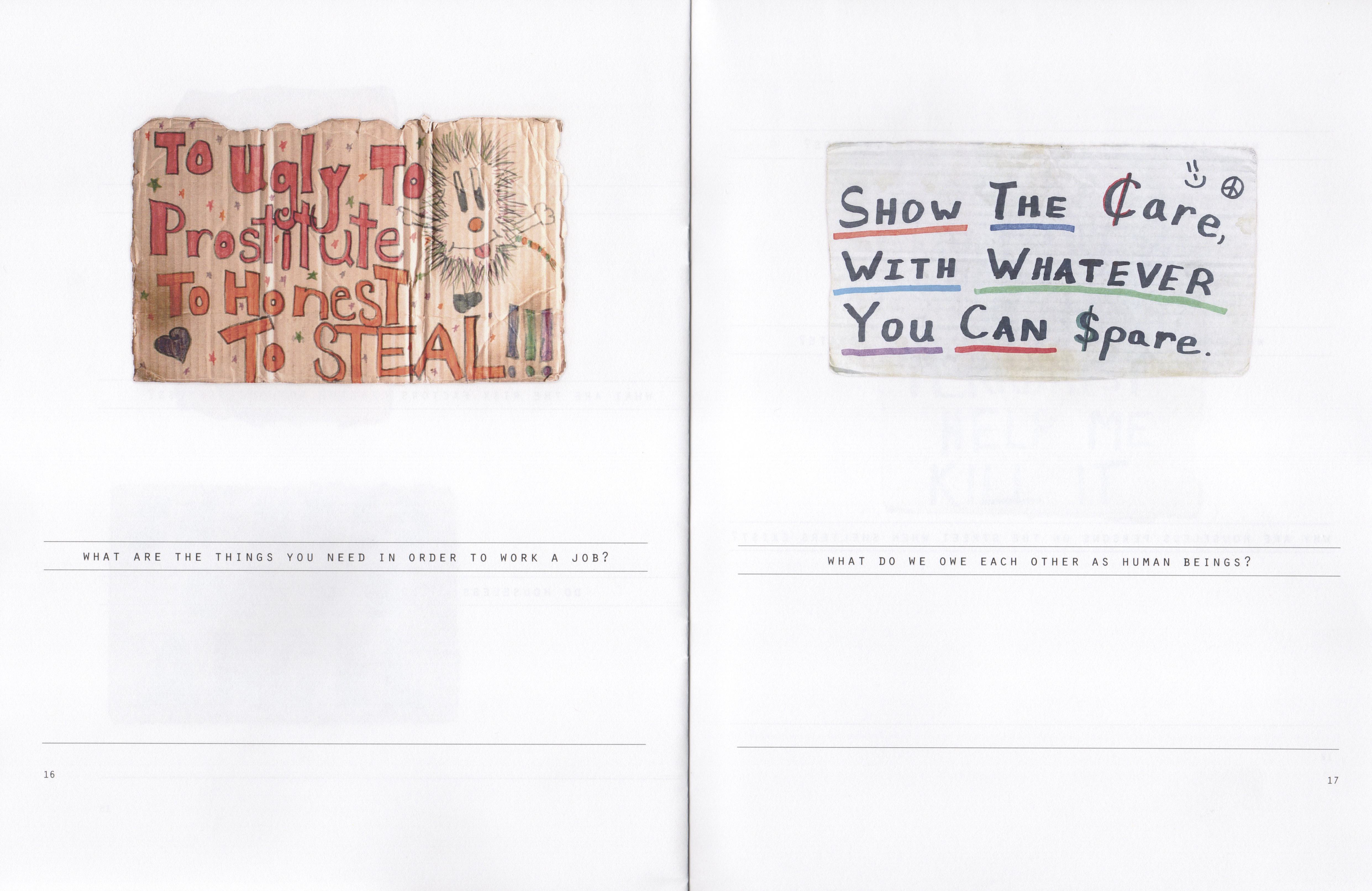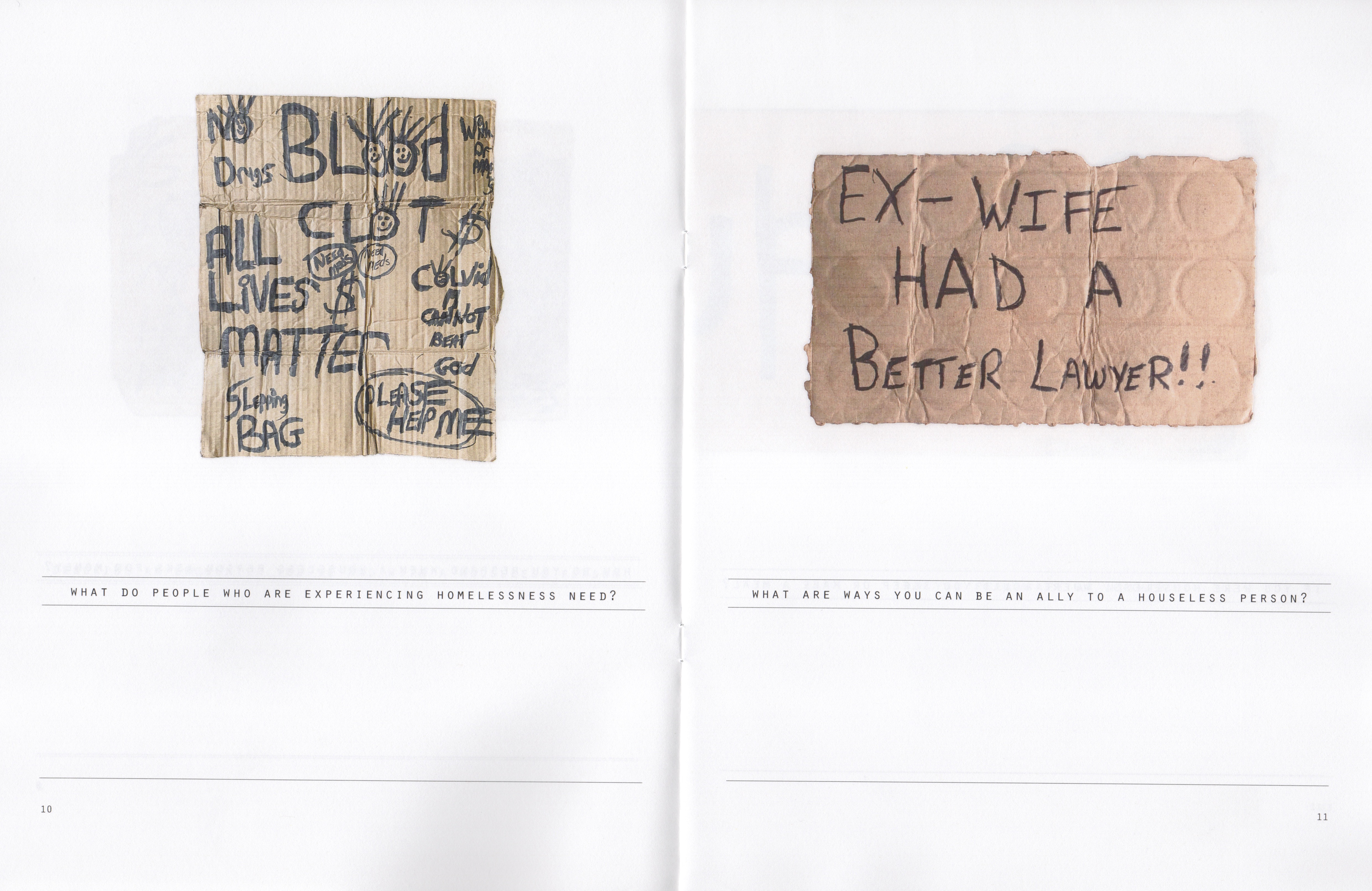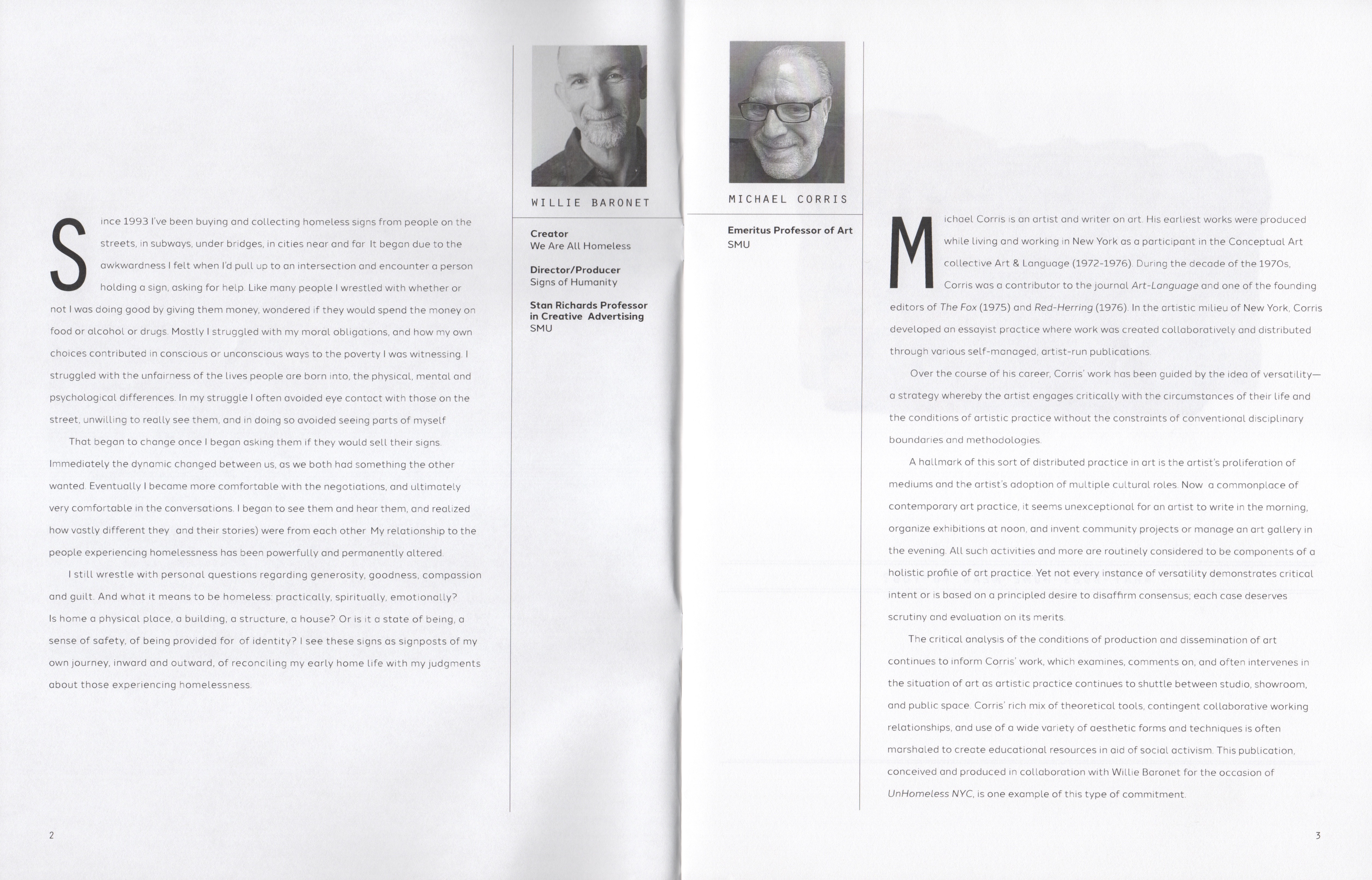 Incident on the Street is a collaborative project by Willie Baronet and Michael Corris. It is illustrated throughout with signs by unhoused individuals collected by Baronet over the course of his decades-long commitment supporting sustainable solutions for individuals who, for whatever reason, find themselves unhoused and vulnerable.