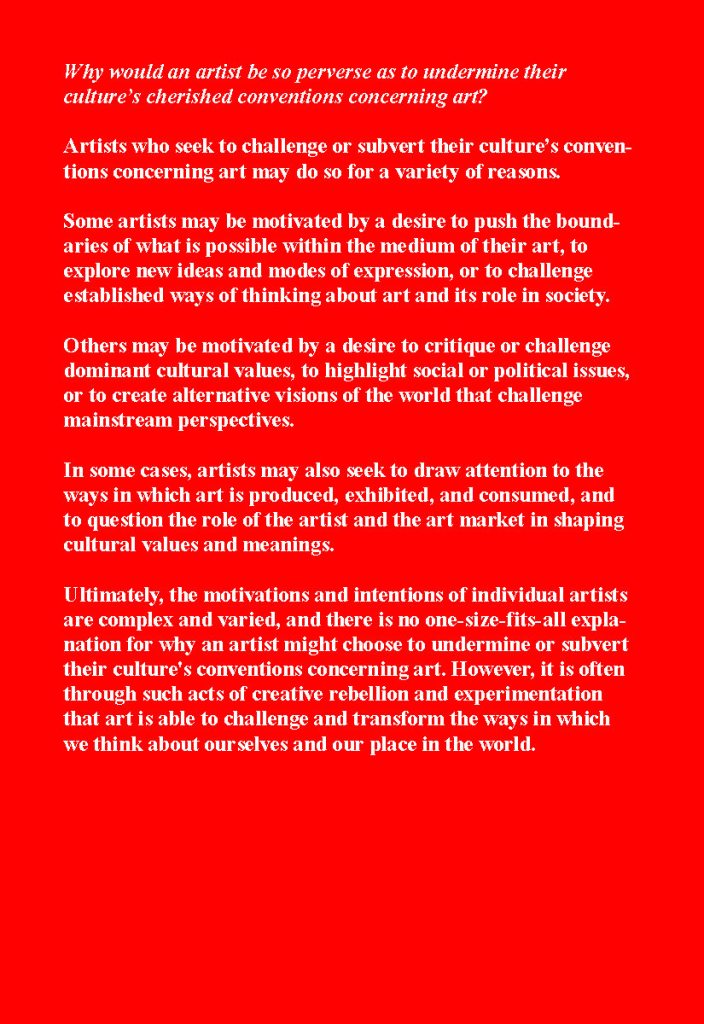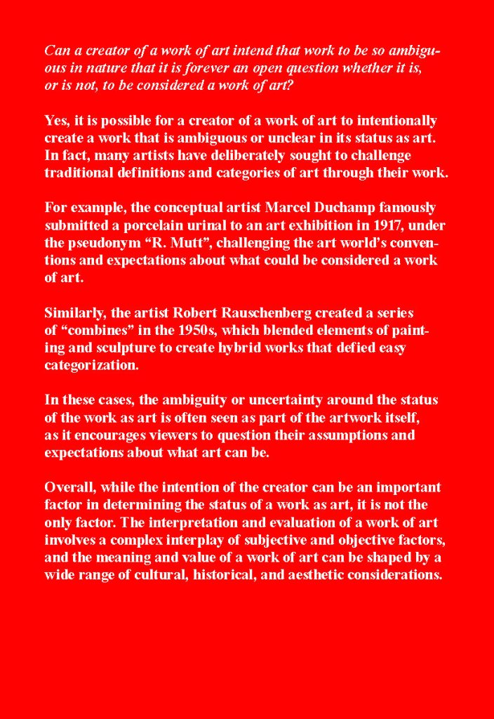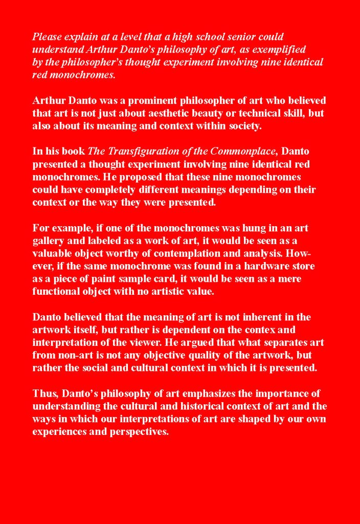 The questions raised by Danto’s thought experiment include, “If all the red monochromes are indistinguishable, why are some taken to be works of art while others are simply ordinary things in the world?” The conversation that takes place between the artists and ChatGPT-4 aims to get to the bottom of Danto’s thought experiment, to reveal some startling ideas about how we think about art. At the same time, we continue to probe the ChatGPT-4, in an effort to hold it to account for its “interpretation” of Danto’s philosophy of art.
