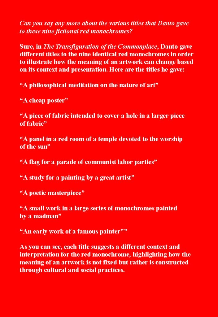 In this new project, nine red monochromes made of handmade paper are accompanied by nine panels of text printed in ink jet on PVC. Each paper monochrome is paired with a text panel that is a transcription of a Q&A between the artists and the Artificial Intelligence (AI) program, ChatGPT-4. The initial question posed to the AI program asks it to explain, in simple terms, Arthur Danto’s famous thought experiment involving an exhibition of nine identical red monochromes. (Danto began with seven red monochromes, then introduced a couple more, just to complicate matters.) In Danto’s original account of the thought experiment, which may be found in his book The Transfiguration of the Commonplace: A Philosophy of Art (1981), each of the red monochromes is paired with a title or a description. Keep in mind that Danto’s original titles for the monochromes differ completely from those that ChatGPT-4 generated. A computer scientist partial to applying anthropomorphic metaphors to AI might say that ChatGPT-4 had “hallucinated” the titles.