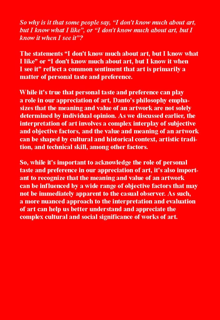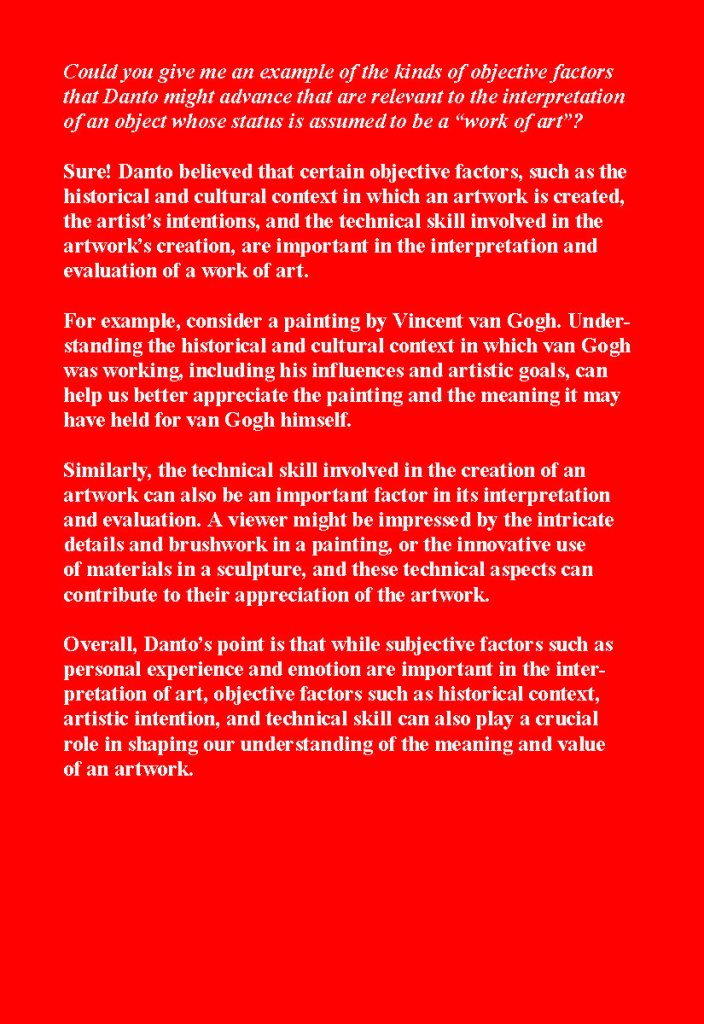 Why take a computer to task for a rather unremarkable interpretation of an art philosopher’s thought experiment? Can a machine learning AI system like ChatGPT-4 illuminate a human viewers’ own interpretations of the meaning of a work of art? Can chatbots go beyond simple explanations of what is what, and understand why Danto’s philosophy might be surprising or valuable to us? Just as we rely on computer programs and AI to do all sorts of mundane tasks for us, will we someday rely on it to tell us how to think and feel about art? Not likely. As a professor of mine used to say, “I can’t teach you anything you don’t already know.”