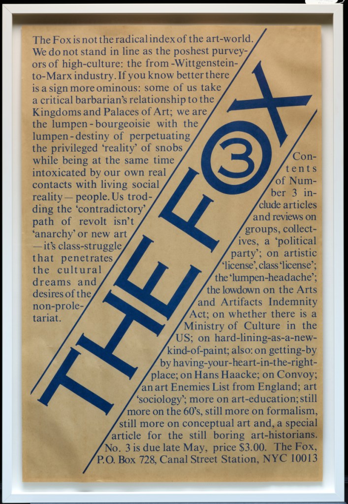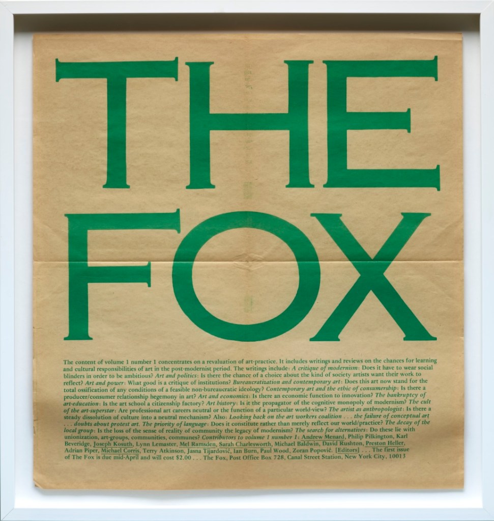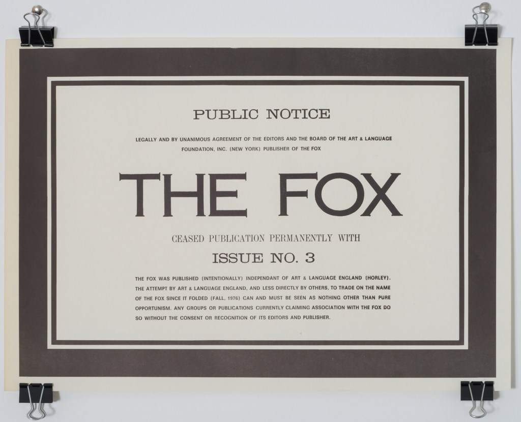“The Fox was, first and foremost, a project by Art & Language, published by New York members of the collective. The intention of this group was to critically address the conditions of art production in New York, a city that had become synonymous with the art market. The contradictory and multivalent lines of argument appearing in The Fox were conjured by the spirit of its mammalian title taken from Isaiah Berlin’s 1953 essay “Hedgehog and the Fox”, which in turn refers to a line from the Greek poet Archilocus: “The fox knows many things, but the hedgehog knows one big thing.” In its pages, voices from within and without the Art & Language collective critiqued the art system, The Fox, and even the very possibility of critique itself. The fiery editorship and contentious discourse indelibly begot the formation’s splintering by its third issue.”