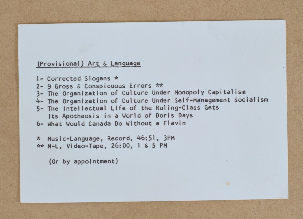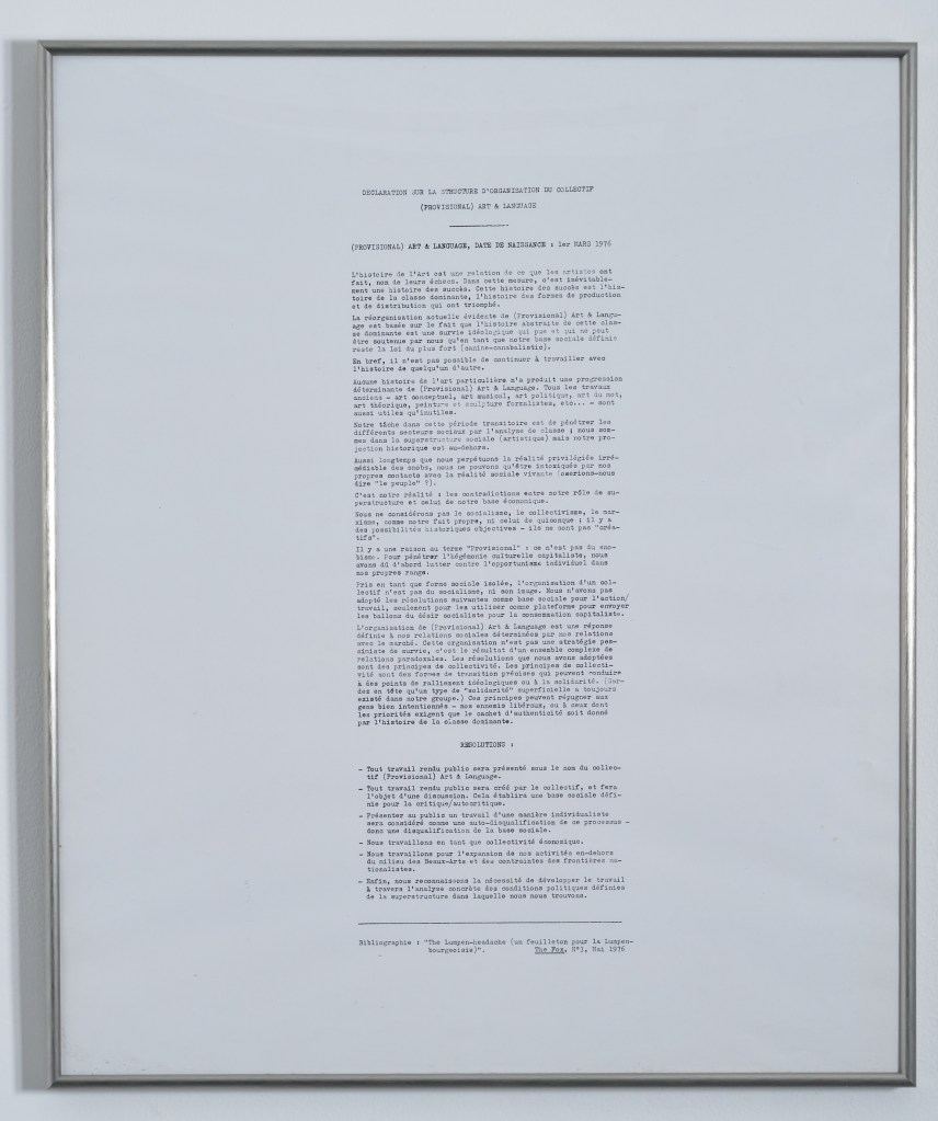 Also on view is a French translation of the “Draft Form of Organization”, a proposal presented at a meeting of Art & Language on March 2, 1976. This document, which was exhibited in Paris at Eric Fabre Gallery in April, 1976, proposes a series of procedural constraints on the members of the group, such as “all work which is ‘made public’ will be represented under the collective name”; “all work which is ‘made public’ has to be discussed and accepted by the general body”; and “working ‘publicly’ in an individualistic manner will be considered as self-disqualification from this process.” (Michael Corris, “Inside a New York Art Gang: Selected Documents of Art & Language New York”, in Alex Alberro and Blake Stimson, eds., Conceptual Art: A Critical Anthology. Cambridge, MA: MIT Press, 1999.)