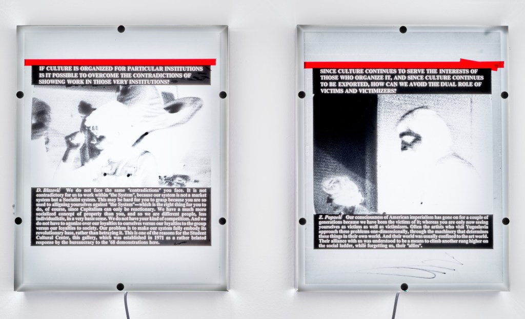 The Organization of Culture Under Self-Management Socialism, 1976 (Art & Language, New York), consists of nine text and image photoprints documenting conversations held at The Student Cultural Center, Belgrade (October 13-16, 1975). Jill Breakstone, Michael Corris, and Andrew Menard initiated discussions on issues relating to international exhibitions, cultural exchange, cultural imperialism, and the situation of avant-garde artists in Yugoslavia. Two film negatives of panels in this series are on view at empire. With permission, empire gallery fashioned a new display environment for the negatives in the form of custom-built light boxes. A recent discussion of this project in the context of the former Yugoslavia may be found in Branislav Jakovljevic, The Performance Apparatus. On the Ideological Production of Behaviors (Ann Arbor, MI: University of Michigan Press, 2025).