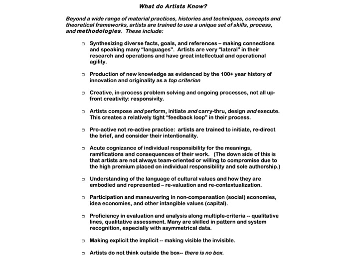 Some contemporary art is profoundly engaged with the world in ways that go beyond interpretation. We seem to be in the midst of a cultural moment where the instrumentalization of art has never been more widely accepted among artists. Whether such artistic practices seek to work across disciplines like science or sociology, or aim to intervene positively in the social and cultural life of communities, the artists involved may be said to hold in common the belief that there is a real advantage that flows from the fact that they come to the scene as artists. We are familiar with the notion of the artist as a problem-solver. But what of other, more contentious knowledge claims?